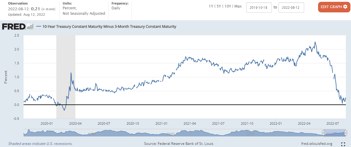 → 미 연준에서 주목하는 것은 10년물과 3개월물의 금리차인데요. 10년물과 2년물의 금리차 역전 현상을 우려하는 목소리가 나올 때, 마다 항상 10년물과 3개월물이 더 중요하다고 언급했었죠. 그랬던 10년물과 3개월물의 금리차도 역전 직전까지 와있는 상황입니다.