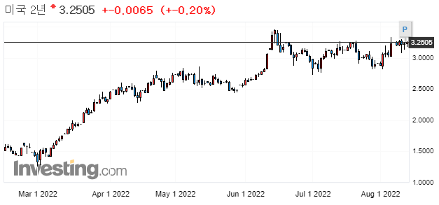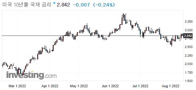 → 7월 28일 미국 GDP가 2분기 연속 마이너스를 기록하였습니다. 2분기 연속 GDP가 마이너스인 경우 경기 침체로 보는데요. 채권 가격의 상승(=채권 수익률 하락)하는 모습을 통해 채권 시장은 경기 침체에 더 무게를 두고 있다는 것을 알 수 있습니다.