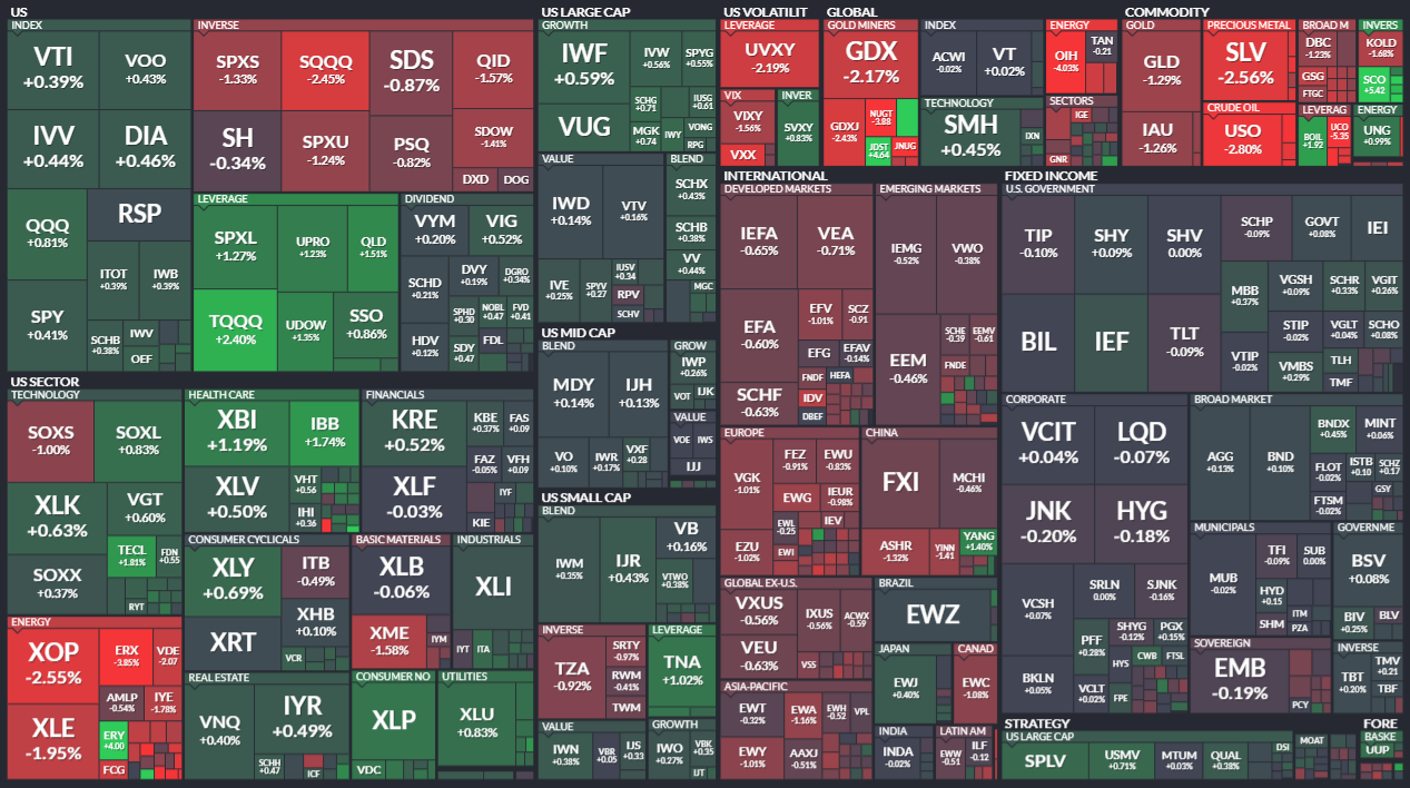 미국 ETF의 등락률을 통해서 시장의 흐름을 살펴봅니다. 특히 주가 MAP과는 다르게 채권이나 원자재, 개발도상국 지수 추종 ETF 등도 살펴볼 수 있기 때문에 좀 더 큰 시장의 흐름을 알 수 있습니다.