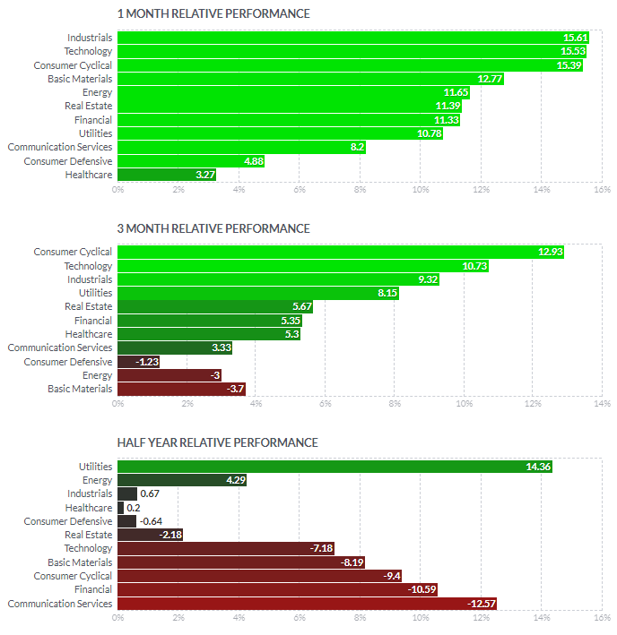 1일/한달/3달/반년 섹터별 등락률을 통해서, 시장 상황을 가늠해볼 수 있습니다.