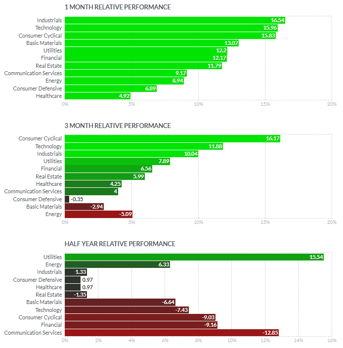 1일/한달/3달/반년 섹터별 등락률을 통해서, 시장 상황을 가늠해볼 수 있습니다.