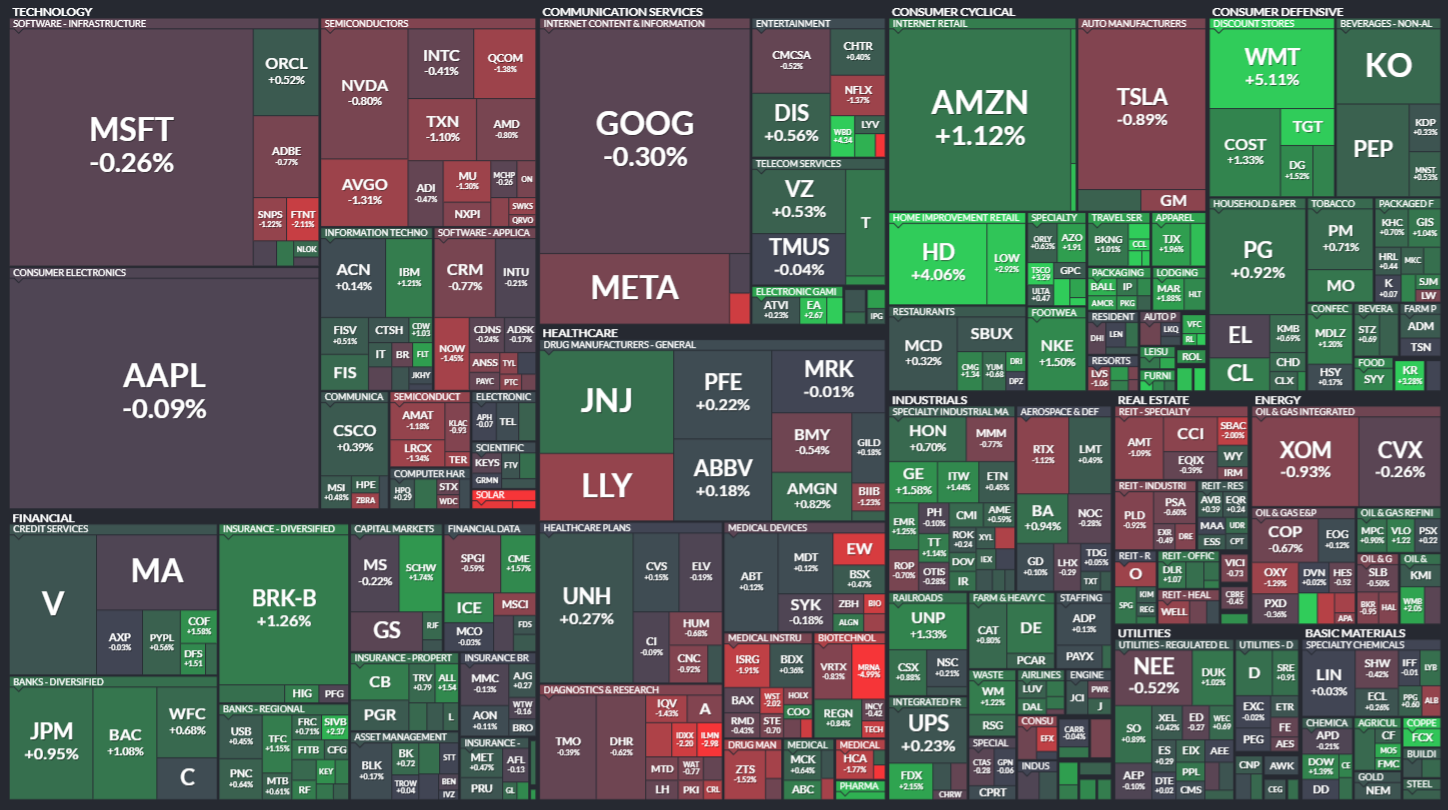 미국 S&P500에 속한 기업들의 주가 등락을 살펴봅니다. 같은 섹터 내에서도 개별 기업 이슈로 인해 주가가 서로 다르게 움직이는 것을 볼 수 있습니다. 특히 섹터 내 대장주, 주도주의 움직임을 통해 해당 섹터의 성장성을 가늠해보기 좋습니다.