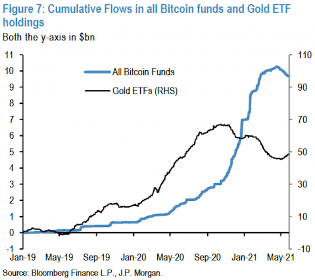 과거 비트코인 가격이 올랐을 때는 반대로 골드ETF에서 비트코인 펀드로 자금이 흘러간 것으로 보였다.