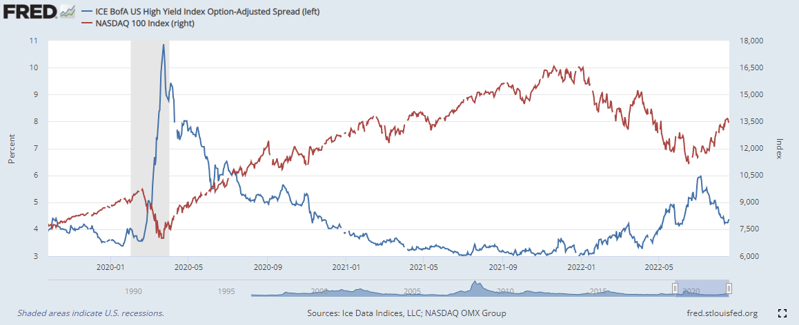 하이일드 채권 스프레드 : 하이일드 채권 수익률 에서 국채 수익률을 뺀 값으로, 이 값이 상승하면 시장이 위험하다는 신호로 볼 수 있습니다. 4% 이하로 하락해야 시장이 안정적인 것으로 판단합니다.