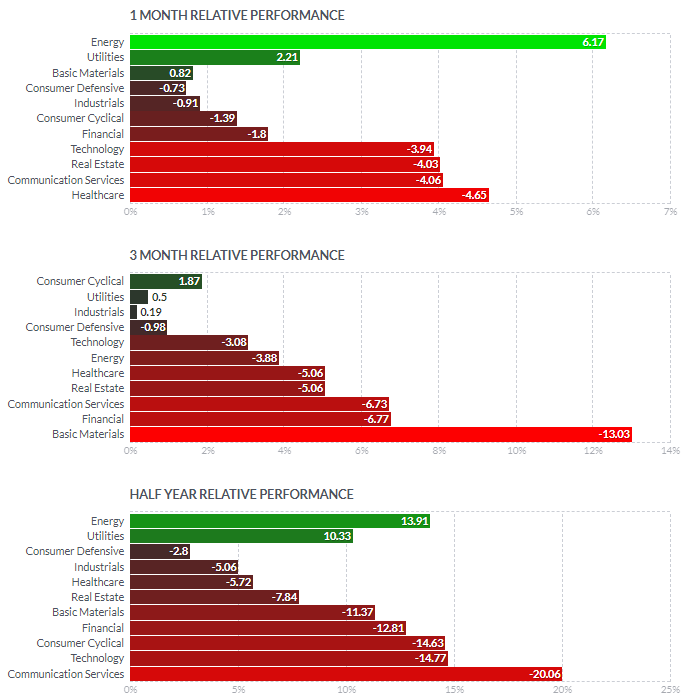 Basic Materials(원자재)가 6개월로 봤을때, -8.67%하락했지만, 최근 1개월로 보면, 6.03%상승했습니다. 이렇듯 추세적으로 다시 상승하는 모습을 보면, 인플레이션이 정점을 지났다는 말이 조금 의구심이 듭니다. 최근 워렌 버핏이 옥시덴탈페트롤리움의 지분 50%를 인수하고 싶다고 SEC에 신고했던 것도 어쩌면 좀 더 큰 그림을 보고 있으셨을지도 모르겠습니다. (워렌 버핏 OXY인수 뉴스 링크)