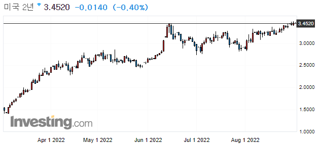 → 잭슨홀 미팅에서 파월 의장이 연설한 내용처럼, 향후, Fed의 금리 인상이 지속되는 상황을 반영하면서, 미국 2년물 국채 수익률이 상승하는 모습을 보였습니다. 미국 2년물 국채 수익률이 전 고점을 깨게된다면, 장단기 스프레드 역전이 너무 심화되기 때문에 과연 그런 일이 벌어질까 의구심이 드는데요. 더 지켜봐야 알 수 있겠지만, 9월은 주식 투자에 있어서 중요한 변곡점이될 것 같습니다.