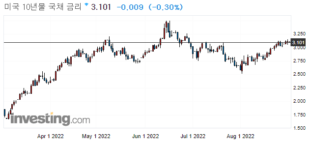 물론 이번 채권 가격 하락은 9월 예정되어 있는 QT를 의식한 움직임이라는 이야기도 있으며, 잭슨홀 미팅 이후, 강력한 긴축 기조에 대한 발언이 있을 것을 예상해서 사전에 하락한다는 이야기도 있습니다.