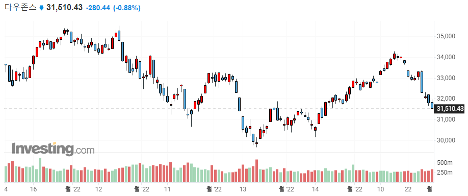 → 22일 유럽 PMI지수가 심각하게 낮게 발표되면서, 유럽발 경기침체 공포가 시장 하락에 요인이 된 것으로 보입니다. 반면, 미국 PMI지수는 50 이상으로 양호한 모습을 보였습니다. (미국 주요 지표 발표 일정 및 결과 참고)