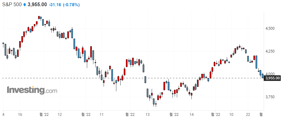 증시에 대한 구루들의 의견 JP모건 트레이딩 데스크 : S&P500 바닥은 3200~3400선일 것 모건스탠리의 제임스 고먼 CEO : 미국이 경기 침체를 겪을 가능성은 거의 없다. 모건스탠리 CIO : Fed 긴축 완화 없
