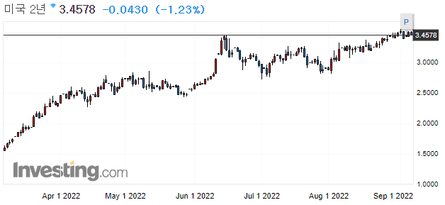 → 잭슨홀 미팅에서 파월 의장이 연설한 내용처럼, 향후, Fed의 금리 인상이 지속되는 상황을 반영하면서, 미국 2년물 국채 수익률이 상승하는 모습을 보였습니다. 미국 2년물 국채 수익률이 전 고점을 깨게된다면, 장단기 스프레드 역전이 너무 심화되기 때문에 과연 그런 일이 벌어질까 의구심이 드는데요. 더 지켜봐야 알 수 있겠지만, 9월은 주식 투자에 있어서 중요한 변곡점이될 것 같습니다.