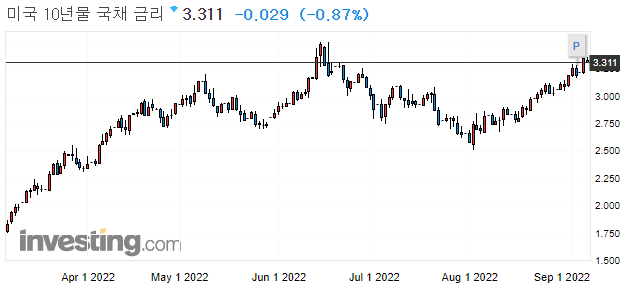 → 9월 6일 10년물 국채 수익률이 다시 한번 크게 상승하였습니다. 현재 3.3에 도달한 상황인데요. 월가에서도 3.5까지는 올라갈 수 있다고 예상하고 있는 상황이므로 추가 상승에 대한 대비가 필요한 것 같습니다.