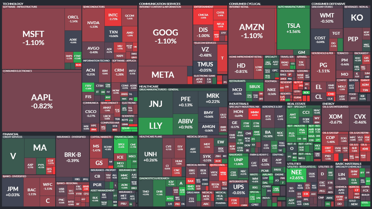 미국 S&P500에 속한 기업들의 주가 등락을 살펴봅니다. 같은 섹터 내에서도 개별 기업 이슈로 인해 주가가 서로 다르게 움직이는 것을 볼 수 있습니다. 특히 섹터 내 대장주, 주도주의 움직임을 통해 해당 섹터의 성장성을 가늠해보기 좋습니다.