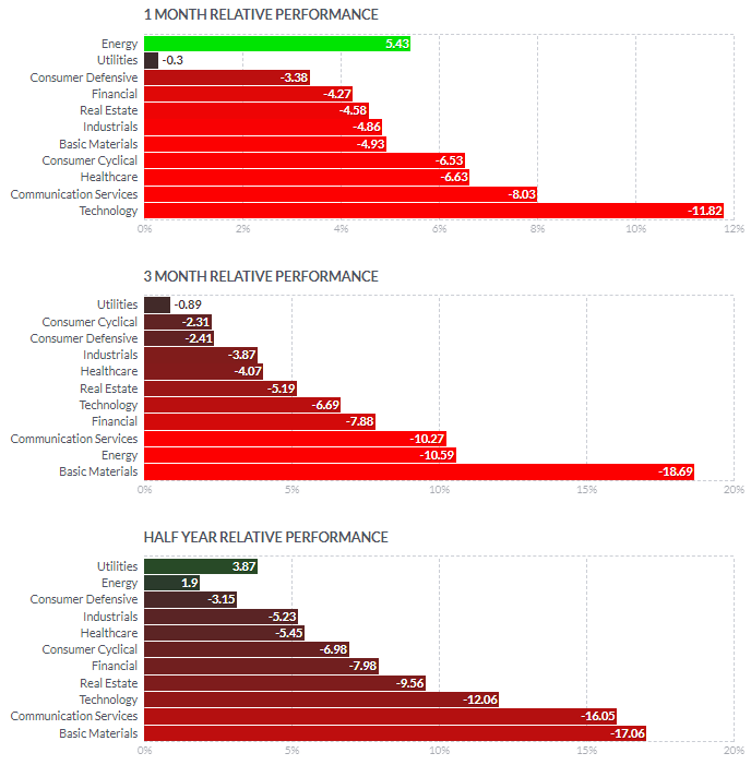 1일/한달/3달/반년 섹터별 등락률을 통해서, 시장 상황을 가늠해볼 수 있습니다.