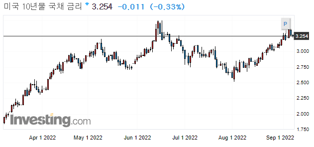 → 9월 6일 10년물 국채 수익률이 다시 한번 크게 상승하였습니다. 현재 3.3에 도달한 상황인데요. 월가에서도 3.5까지는 올라갈 수 있다고 예상하고 있는 상황이므로 추가 상승에 대한 대비가 필요한 것 같습니다.