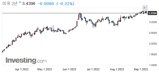 → 잭슨홀 미팅에서 파월 의장이 연설한 내용처럼, 향후, Fed의 금리 인상이 지속되는 상황을 반영하면서, 미국 2년물 국채 수익률이 상승하는 모습을 보였습니다. 미국 2년물 국채 수익률이 전 고점을 깨게된다면, 장단기 스프레드 역전이 너무 심화되기 때문에 과연 그런 일이 벌어질까 의구심이 드는데요. 더 지켜봐야 알 수 있겠지만, 9월은 주식 투자에 있어서 중요한 변곡점이될 것 같습니다.