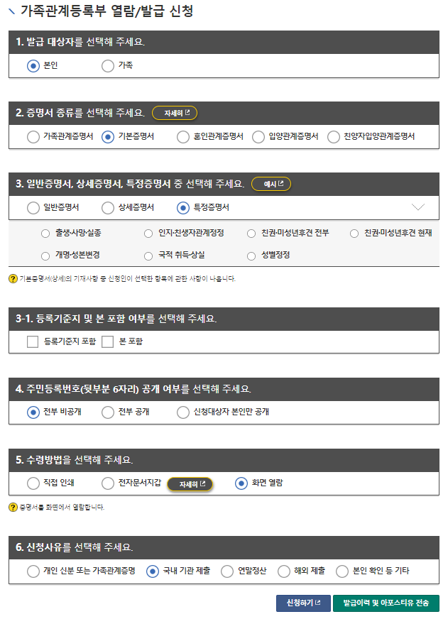 3. 열람/발급 신청에 대한 세부적인 옵션을 선택합니다.