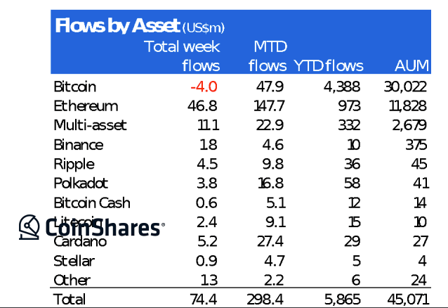 덧붙여 암호화폐의 상장 투자 상품(ETP) 등을 제공하는 CoinShares가 1일에 개시한 주차 데이터에 의하면, 비트코인 관련 금융상품이 400만달러 순유출이 된 반면, 이더리움 펀드로의 순유입은 4700만달러에 이르렀다.
