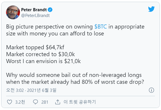 저명 투자가 피터·브란트씨는 3일, 비트코인 시세에 언급.향후 예상되는 최악의 시나리오로서 「1 BTC=21,000달러(230만엔)」까지의 하락도 일어날 수 있다며 주의를 재촉했다.