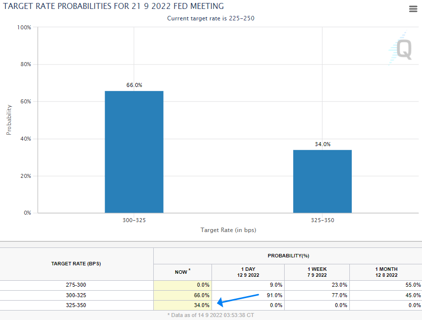 → 9월 7일 Fed에 출입하는 월스트리트 저널에 닉 티밀라우스 기자가 9월 21일 75bp인상할 것이라는 기사를 내었습니다. FedWatch에서 예상하는 미국 9월 금리 인상 폭은 75bp확률이 높아졌습니다.
