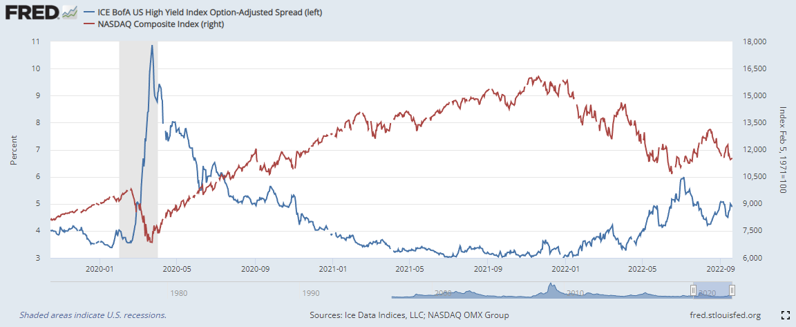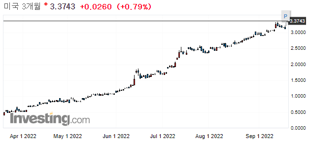 → 9월 13일 CPI 발표 후, 미국 10년물 국채 수익률이 급등하였습니다. 아직 장 초반이라 3.5를 넘지는 않았는데요. CPI가 예상치를 웃돌면서, Fed가 더 강한 금리 인상을 할 수 밖에 없는 상황이 만들어져가고 있기 때문입니다. (미국 투자자 입장에서는 폴 볼커 의장의 강력한 금리 인상에 대한 공포가 떠오르지 않을 수 없는 상황입니다.) 하지만, 이러한 금리 인상은 필연적으로 경기 침체를 불러올 수 밖에 없기 때문에 향후, 장기 국채들의 움직임을 주시해야할 필요가 있습니다.
