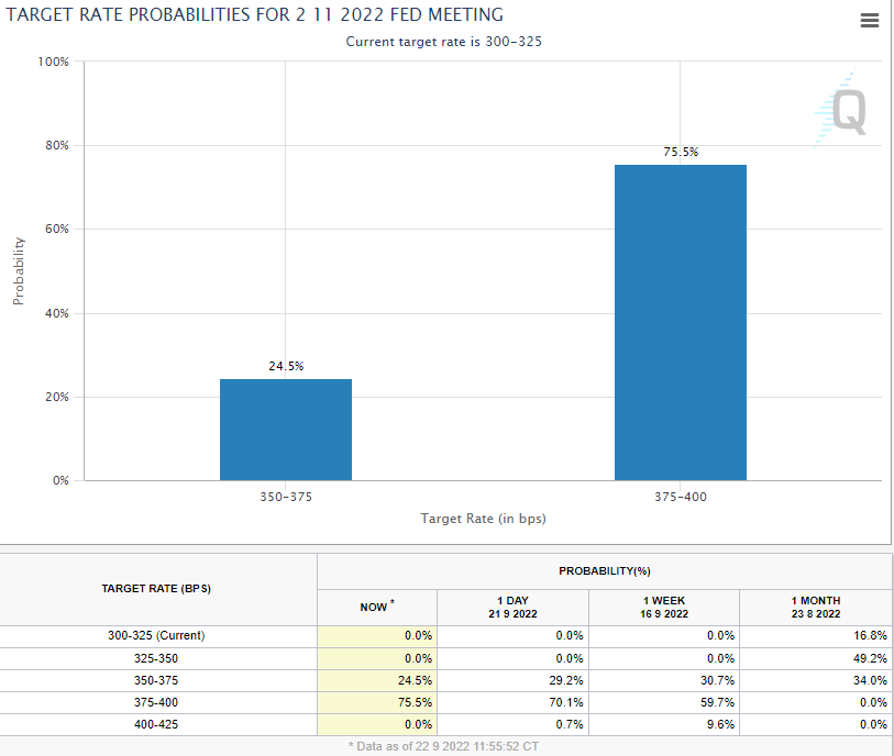 → 9월 13일 소비자물가지수가 예측치를 크게 상회하면서, 미국의 인플레이션이 쉽게 잡히지 않을 것임을 보여주었습니다. 이로인해 FedWatch에서는 75bp인상에 더하여, 100bp인상에 대한 확률이 높아지는 모습입니다.