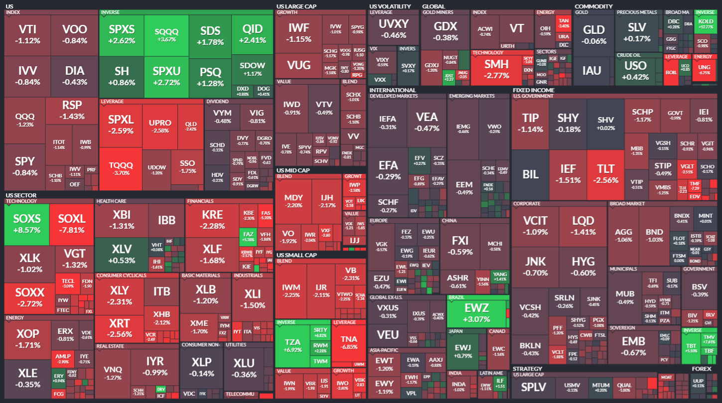 미국 ETF의 등락률을 통해서 시장의 흐름을 살펴봅니다. 특히 주가 MAP과는 다르게 채권이나 원자재, 개발도상국 지수 추종 ETF 등도 살펴볼 수 있기 때문에 좀 더 큰 시장의 흐름을 알 수 있습니다.