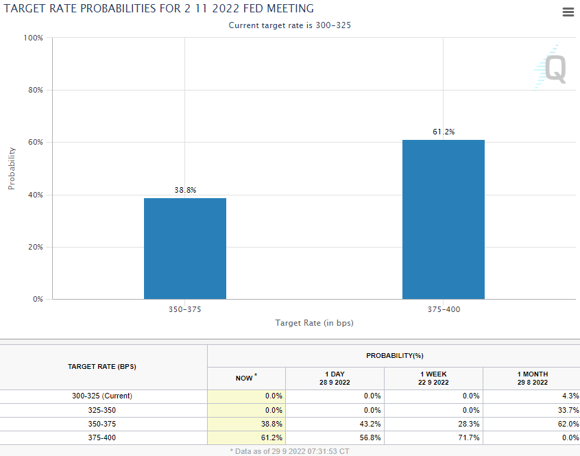 → 9월 21일 Fed는 금리를 75bp 인상하여, 현재 미국 기준 금리는 3.25%입니다. 이는 연준 의원들이 그 동안 발언해왔던 수치와 동일하며, 올해 기준 금리에 대한 예상치는 4.4%로 발표하였습니다.