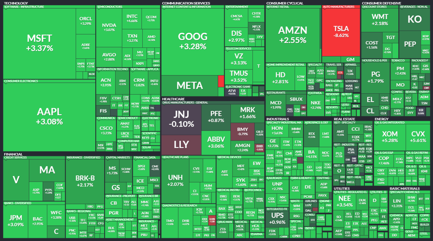 미국 S&P500에 속한 기업들의 주가 등락을 살펴봅니다. 같은 섹터 내에서도 개별 기업 이슈로 인해 주가가 서로 다르게 움직이는 것을 볼 수 있습니다. 특히 섹터 내 대장주, 주도주의 움직임을 통해 해당 섹터의 성장성을 가늠해보기 좋습니다.