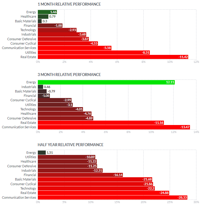 1일/한달/3달/반년 섹터별 등락률을 통해서, 시장 상황을 가늠해볼 수 있습니다.