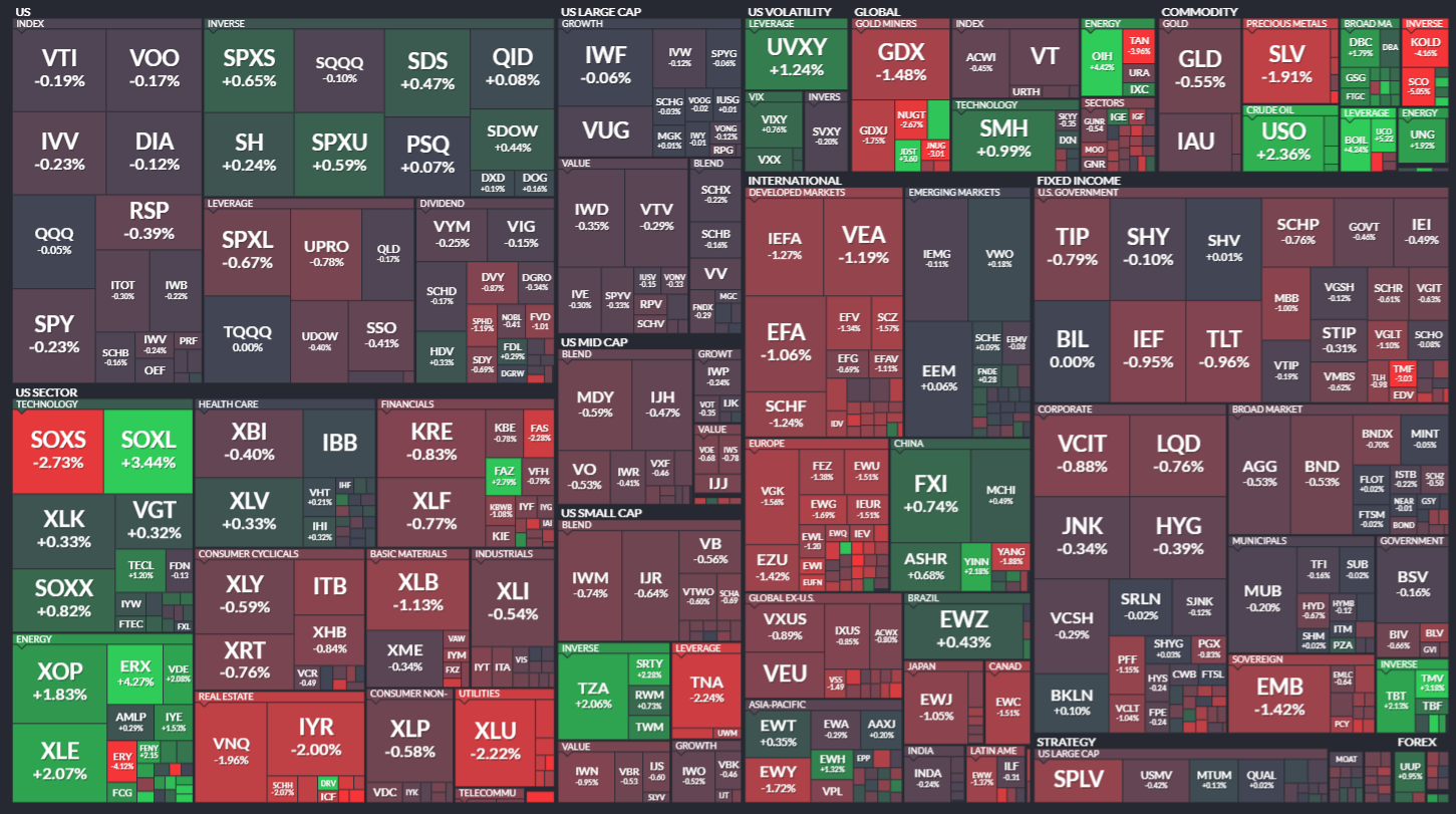 미국 ETF의 등락률을 통해서 시장의 흐름을 살펴봅니다. 특히 주가 MAP과는 다르게 채권이나 원자재, 개발도상국 지수 추종 ETF 등도 살펴볼 수 있기 때문에 좀 더 큰 시장의 흐름을 알 수 있습니다.