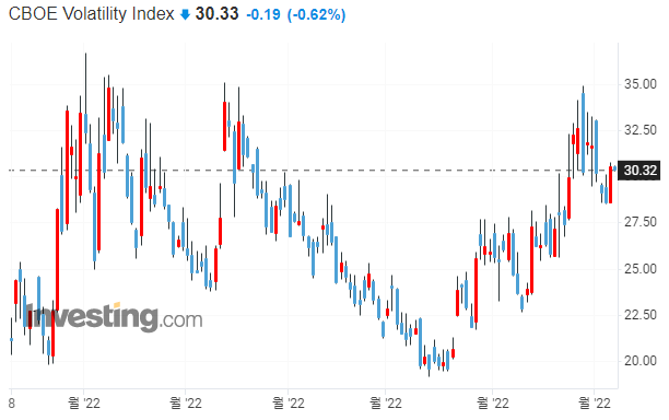→ 10월 3일 VIX지수는 30으로 하락하였습니다. 아직은 추세선 하단에 위치함으로 추가 상승도 충분히 나올 수 있는 상황입니다.