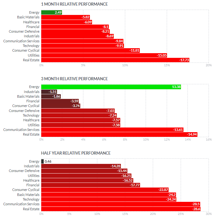 1일/한달/3달/반년 섹터별 등락률을 통해서, 시장 상황을 가늠해볼 수 있습니다.