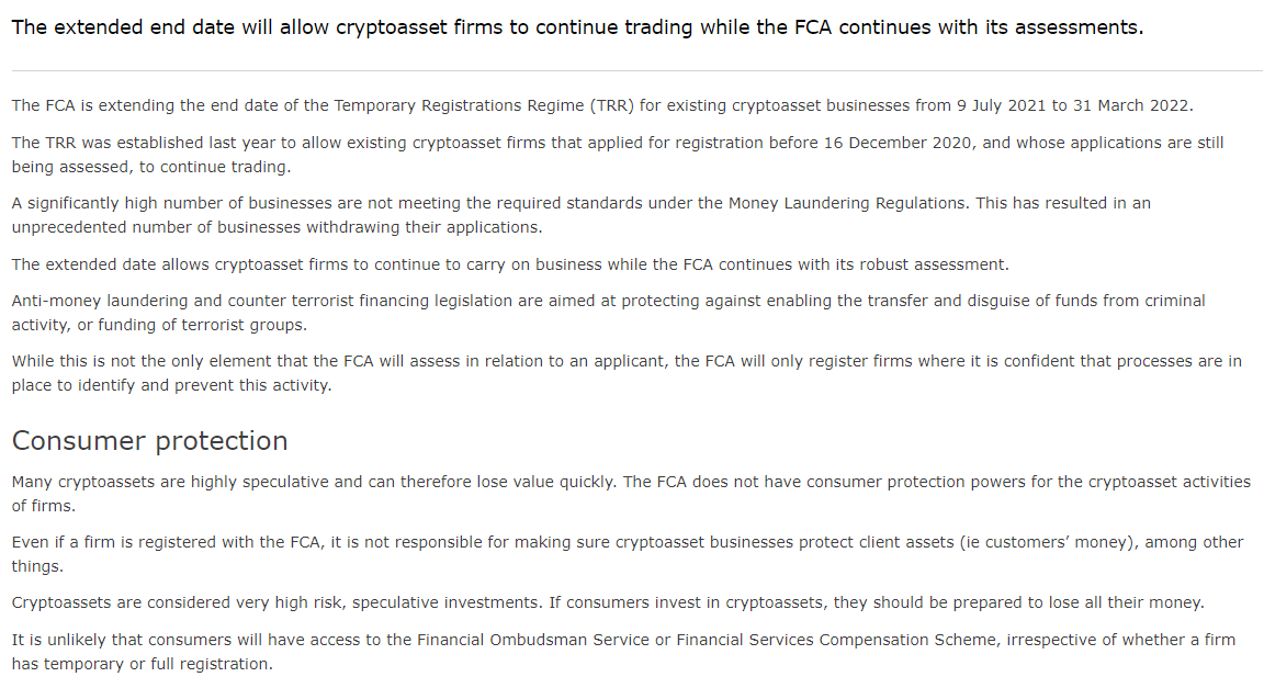 이번에 시한이 연장됨에 따라 암호화폐 관련 기업은 FCA 심사 기간 동안 사업을 더 계속할 수 있게 됐다.FCA는 연장의 발표에서, 다음과 같이 말했다.