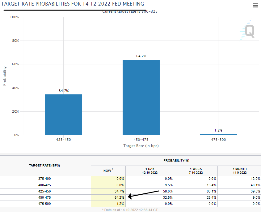 → 10월 13일 미국 소비자 물가지수(CPI)가 컨센서스보다 높게 발표되면서, FedWatch에 금리 인상 예상치가 11월 75bp 12월에도 75bp로 높아졌습니다.