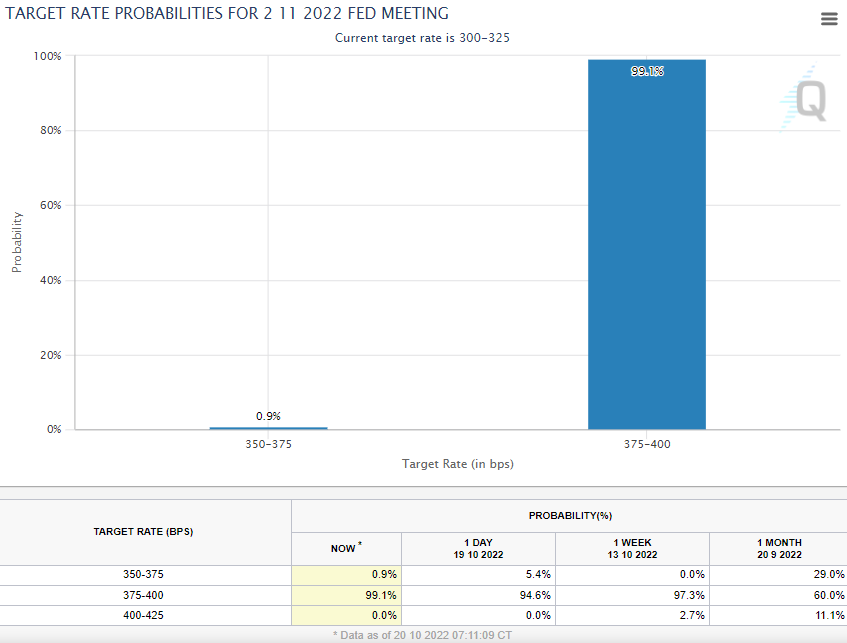 → 10월 13일 미국 소비자 물가지수(CPI)가 컨센서스보다 높게 발표되면서, FedWatch에 금리 인상 예상치가 11월 75bp 12월에도 75bp로 높아졌습니다.