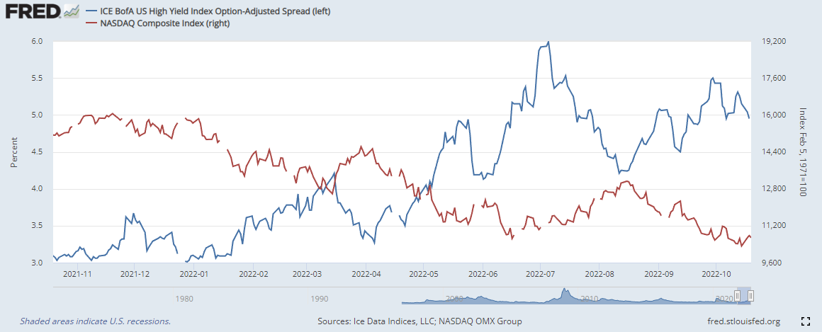 하이일드 채권 스프레드 : 하이일드 채권 수익률 에서 국채 수익률을 뺀 값으로, 이 값이 상승하면 시장이 위험하다는 신호로 볼 수 있습니다. 4% 이하로 하락해야 시장이 안정적인 것으로 판단합니다.