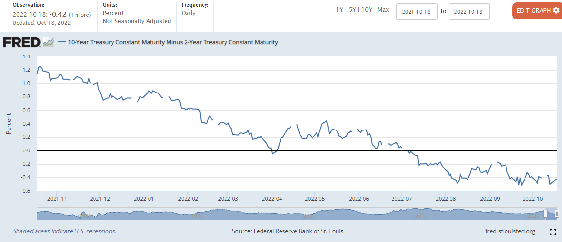(10년물과 3개월물의 금리차 역전은 현재 상황이 확실한 경기 침체 상황이라는 것을 의미한다고 볼 수 있습니다. 각종 매체에서는 경기 침체가 아니라고 말하지만, 사실상 우리는 올해 이미 경기 침체를 겪고있다고 볼 수 있겠습니다.)