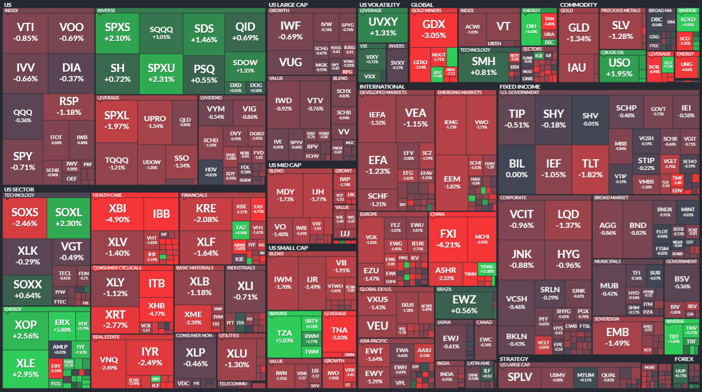미국 ETF의 등락률을 통해서 시장의 흐름을 살펴봅니다. 특히 주가 MAP과는 다르게 채권이나 원자재, 개발도상국 지수 추종 ETF 등도 살펴볼 수 있기 때문에 좀 더 큰 시장의 흐름을 알 수 있습니다.