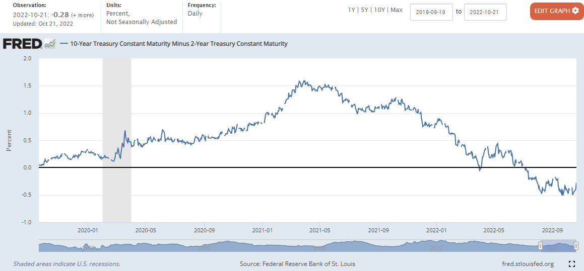 (10년물과 3개월물의 금리차 역전은 현재 상황이 확실한 경기 침체 상황이라는 것을 의미한다고 볼 수 있습니다. 각종 매체에서는 경기 침체가 아니라고 말하지만, 사실상 우리는 올해 이미 경기 침체를 겪고있다고 볼 수 있겠습니다.)