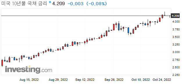 → 10월 20일 영국에 리즈 트러스 영국 총리가 결국 사임했습니다. 이러한 여파인지 영국의 국채 시장은 다소 안정되는 모습을 보이고 있는데요. 오히려 이번에는 미국 10년물 국채 수익률이 급등하는 모습을 보였습니다. 들리는 소문으로는 영국 보험사와 연기금이 국채 레버리지를 정리하면서 미국 국채를 매도하였고 이를 반영하여, 채권 금리가 치솟은 것이라는 이야기가 돌고 있습니다.