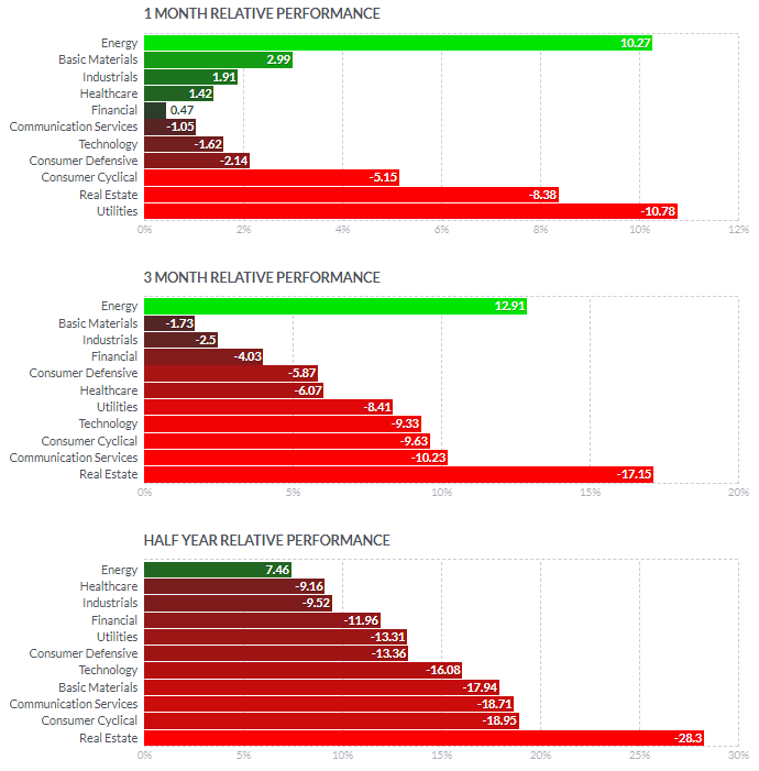 1일/한달/3달/반년 섹터별 등락률을 통해서, 시장 상황을 가늠해볼 수 있습니다.