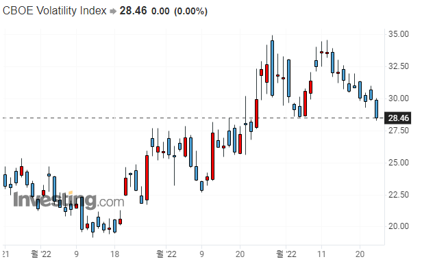 → 10월 25일 VIX 지수가 기술적 분석상 지지대에 위치하였습니다. 이 상태에서 크게 하락해 준다면, 이후 한동안 주식 시장이 랠리를 보일 것이라고 기대할 수 있는데요. 반대로 이 지지대에서 지지를 받아 다시 상승한다면, 좀 더 상황을 지켜볼 필요가 있겠습니다.