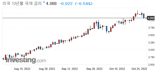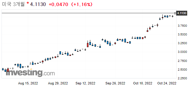 10년물 국채 수익률 4.100 / 2년물 국채 수익률 4.4728 / 3개월물 국채 수익률 4.1130