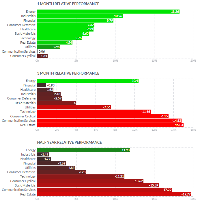 1일/한달/3달/반년 섹터별 등락률을 통해서, 시장 상황을 가늠해볼 수 있습니다.