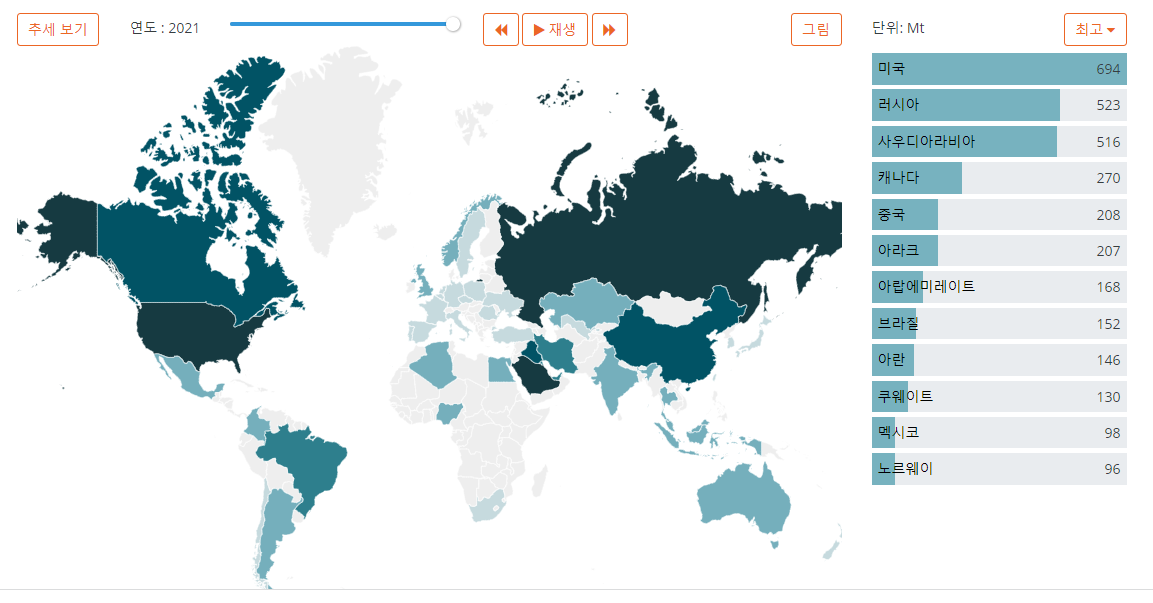 사실상 유가 상승에 대한 최대 수혜국도 미국이 맞습니다. 물론 이 많은 원유를 대부분 자국내에서 소비하는 경향이 있지만(차량 운행이 많음) 이후 기술 혁신으로 전기차 생산량이 많아지고, 인프라가 개선된다면, 상당 부분 에너지를 수출할 수 있는 잠재력을 가진 나라 또한 미국 입니다.