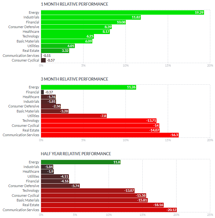 1일/한달/3달/반년 섹터별 등락률을 통해서, 시장 상황을 가늠해볼 수 있습니다.