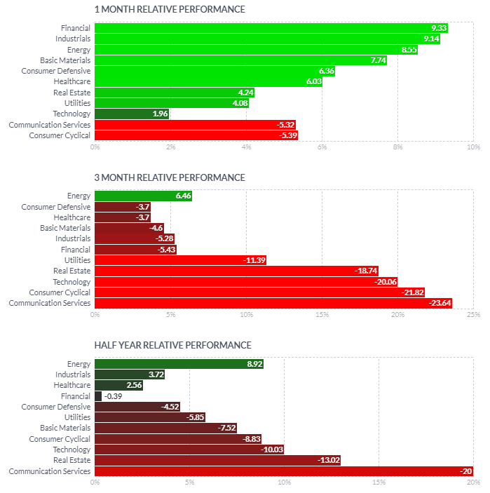 1일/한달/3달/반년 섹터별 등락률을 통해서, 시장 상황을 가늠해볼 수 있습니다.