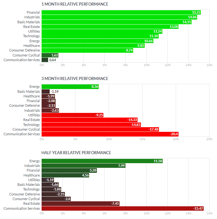 1일/한달/3달/반년 섹터별 등락률을 통해서, 시장 상황을 가늠해볼 수 있습니다.