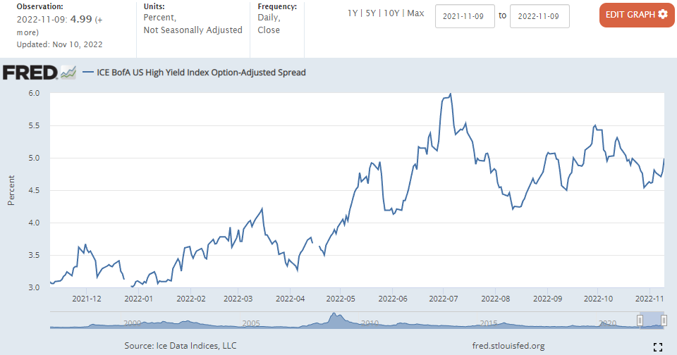 하이일드 채권 스프레드 : 하이일드 채권 수익률 에서 국채 수익률을 뺀 값으로, 이 값이 상승하면 시장이 위험하다는 신호로 볼 수 있습니다. 4% 이하로 하락해야 시장이 안정적인 것으로 판단합니다.