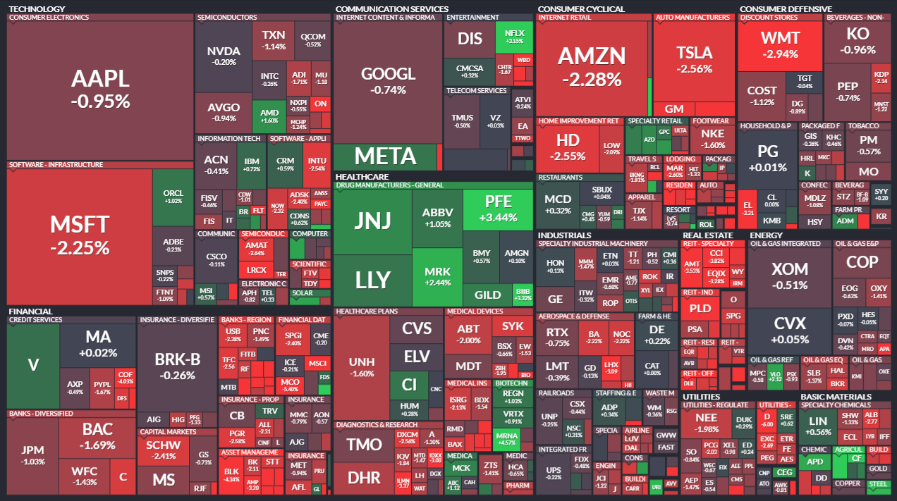 미국 S&P500에 속한 기업들의 주가 등락을 살펴봅니다. 같은 섹터 내에서도 개별 기업 이슈로 인해 주가가 서로 다르게 움직이는 것을 볼 수 있습니다. 특히 섹터 내 대장주, 주도주의 움직임을 통해 해당 섹터의 성장성을 가늠해보기 좋습니다.
